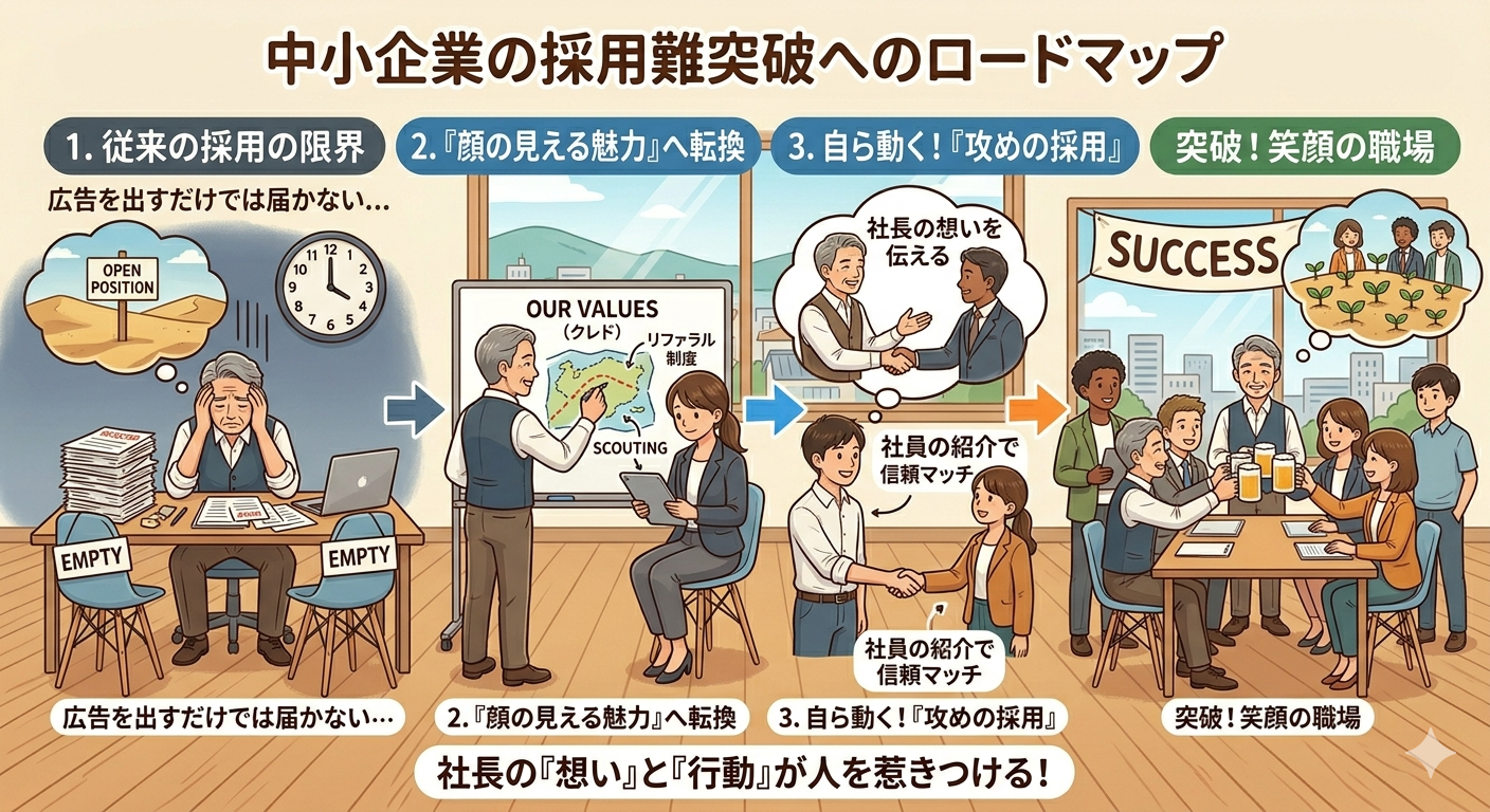 採用難の本当の解決策は、求人票を直すことではなく、**「社長がどんな想いで、どこを目指しているのか」を外に向かって一貫して語り続けることです。