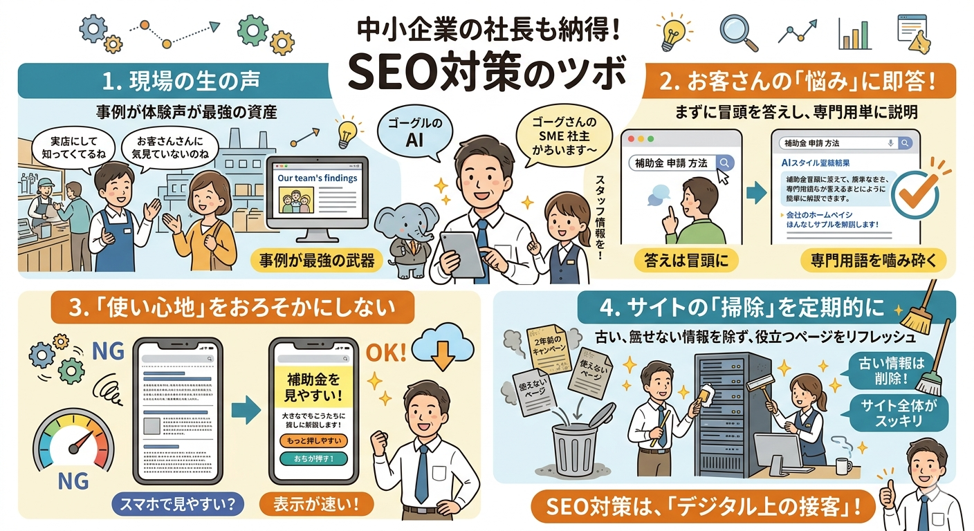 テクニックに走る前に、ターゲットとする読者(例えば中小企業の経営者など)が何に悩み、どのような言葉であればその悩みが解決すると確信できるかを突き詰めることが、結果として最強のSEO対策になります。